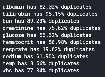 There are a lot of missing values in the feature set. It is also observed that some features are missing in pairs. For example, the number of missing values for d1_glucose_max and d1_glucose_min is the same. We also noticed there are a lot of common values in some apache and vital columns.