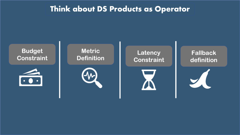 - A framework to think about DS features like operators (latency, budget, reliability, failure modes, safest default)