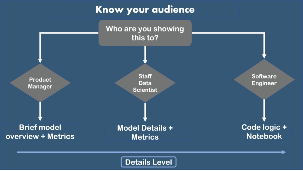 If we are showing this to a Staff Data Scientist for model evaluation, or we are showing this to a Software Engineer so they can implement our model in production, or a Product Manager that will need to report the work to higher decisional roles, we will need different kinds of deliveries.