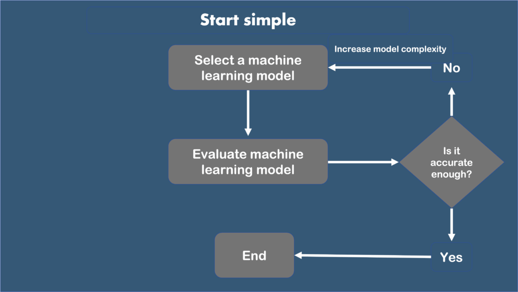 When I say “reasonably simple” I mean that, for certain complex problems, some very basic Machine Learning algorithms might already be out of the picture. For example, if you have to build a complex NLP application, you probably will never use Logistic Regression and it is safe to start from a more complex architecture from Hugging Face (e.g. BERT).