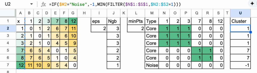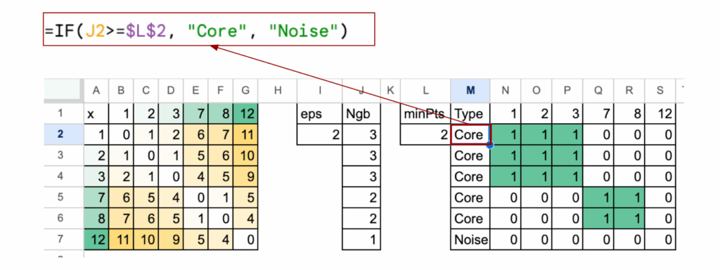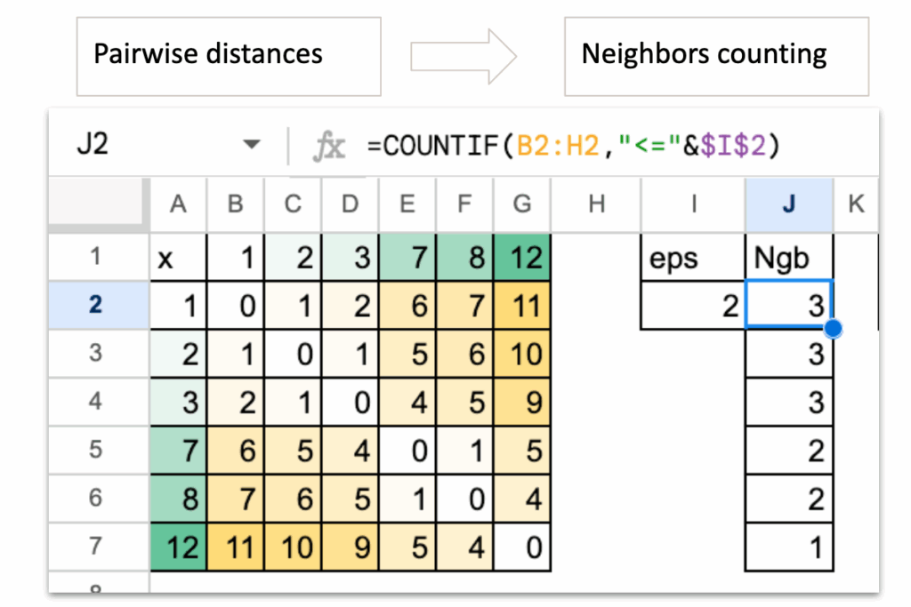 So in Excel, the first step is to compute the pairwise distance matrix, then count how many neighbors each point has within eps.