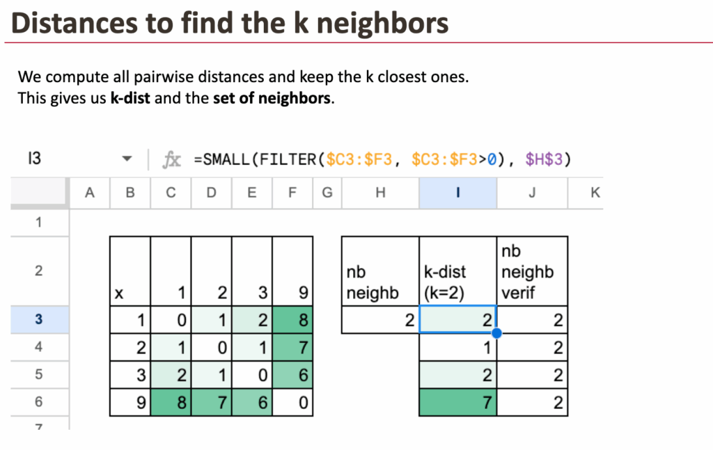 In Excel, we can do a pairwise distance matrix to get the k-distance for each point.