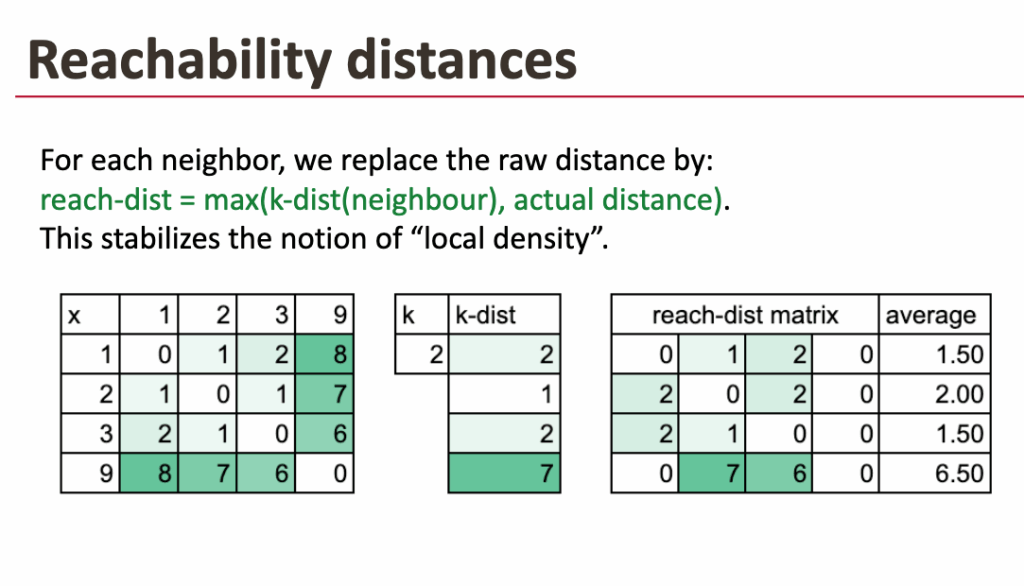- Distance to 3 = 1, but k-distance(3) = 2 → reach-dist(2, 3) = 2