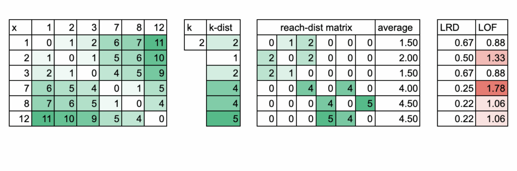 This matches the intuition: 12 is far from everyone. - LOF, however, highlights 7 instead.