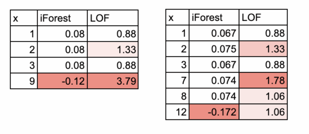 If we look closer, for Isolation Forest: 1, 2 and 3 have no differences in score. And LOF gives a higher score for 2. This is what we already noticed.