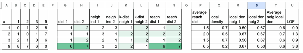 - If LRD(p) is much larger → LOF < 1. So p is in a very dense pocket.