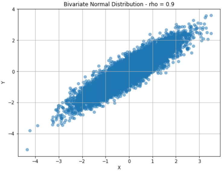 In the following plots, the random variables X and Y are distributed as standard normals N(0, 1). We will see how the plots change when setting different values for their correlation ρ.