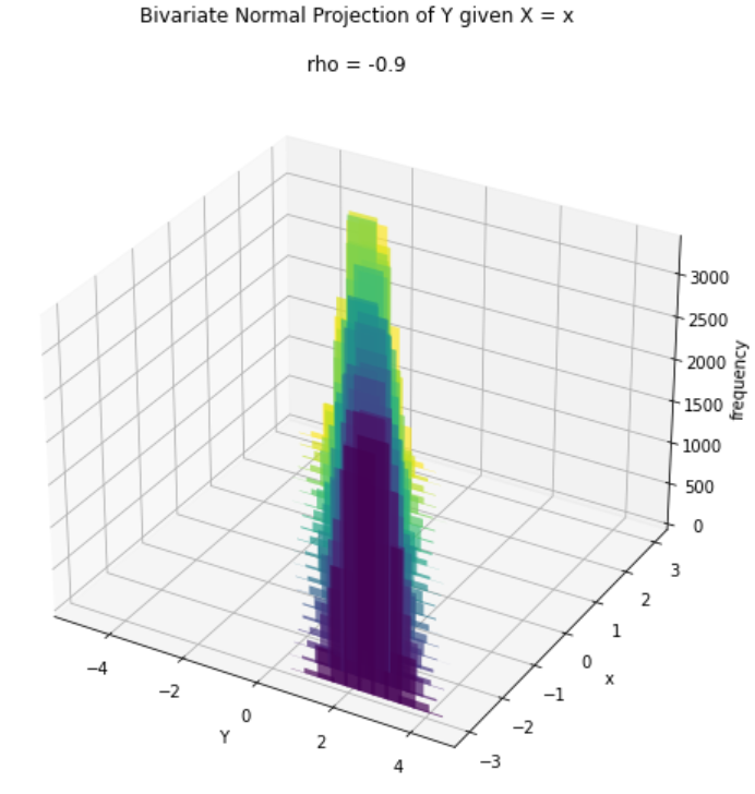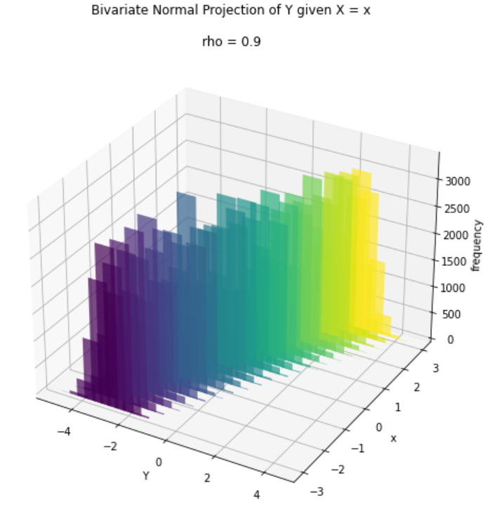 Plotting the projection we can now see that the distribution of Y is actually affected by different values of x. It is interesting to notice the fact that the mean value of Y is dependent on x (as its value depends on the difference between x and _μX) while the variance of Y doesn’t change with x, as it is only dependent by the correlation ρ. Moreover, notice that the variance is smaller than the case with _ρ=0,_ since it scales with 1-ρ².