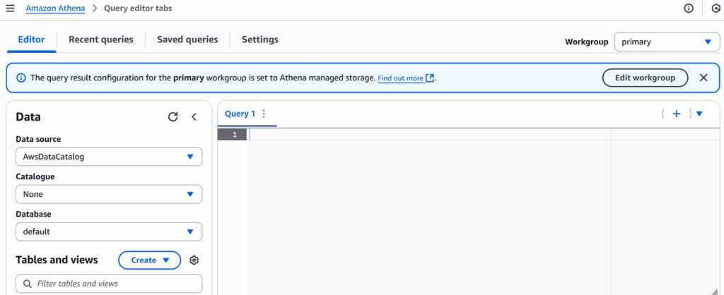 Once you’ve signed into AWS, open Athena in the console and set your workgroup, engine version and S3 output location (for query results). To do this, look for a hamburger-style menu icon on the top left of the Athena home screen. Click on it to bring up a new menu block on the left. In there, you should see an Administration-> Workgroups link. You will automatically be assigned to the primary workgroup. You can stick with this or create a new one if you like. Whichever option you choose, edit it and ensure that the following options are selected.