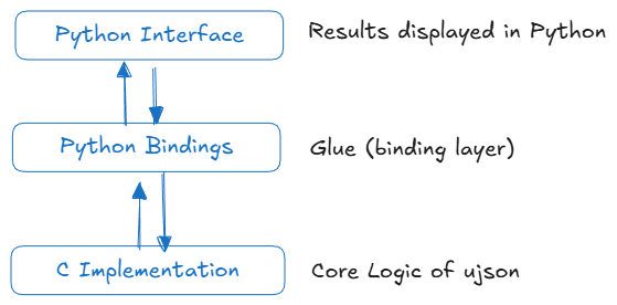 Ujson has been a widely used library in many applications involving large JSON payloads, as it was designed to be a faster alternative to the stdlib JSON in Python. The speed of parsing is great since the underlying code of ujson has been written in C, with Python bindings that connect to the Python interface. The areas that needed improvement in the standard JSON library were optimized in Ujson for speed and performance. But, Ujson is no longer used in newer projects, as the makers themselves have mentioned on PyPI that the library has been placed in maintenance-only mode. Below is an illustration of ujson’s processes at a high-level.