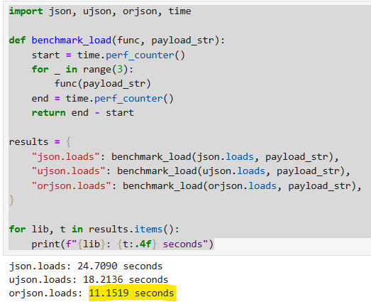 We then create a benchmarking function with two arguments. The first argument is the function that is being tested. In this case, it is the loads() function. The second argument is the payload_str constructed from the file above.