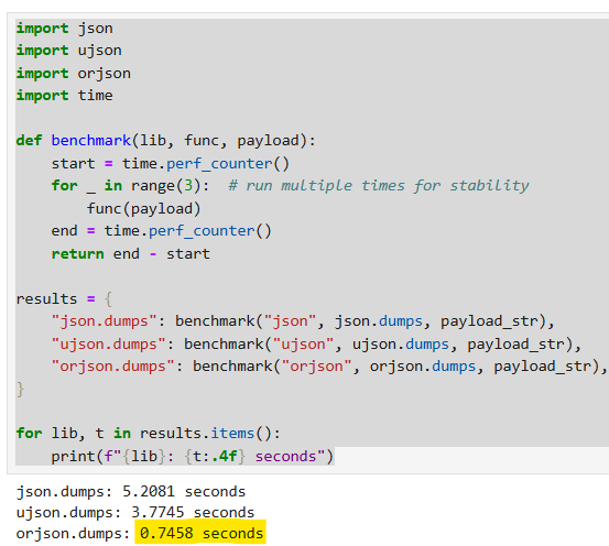 On comparing run times, we see that orjson takes the least amount of time to serialize Python objects to a JSON object.