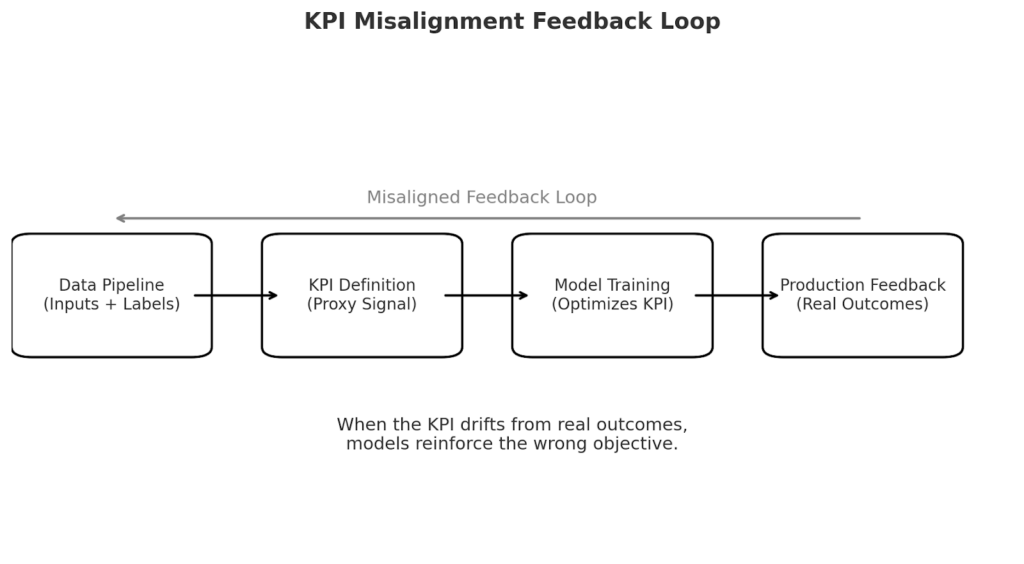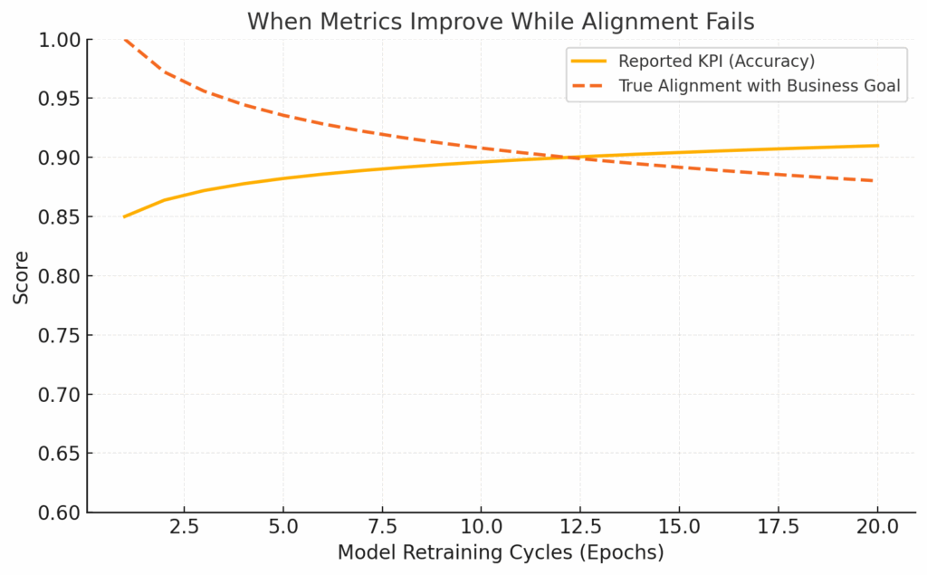 Worse still, when such metrics are included in the model optimisation process, a downward spiral may occur. The model overfits to pursue the KPI. The misalignment is reaffirmed by retraining. Misinterpretation is spurred by optimisation. And unless one interrupts the loop by hand, the system degenerates as it reports the progress.