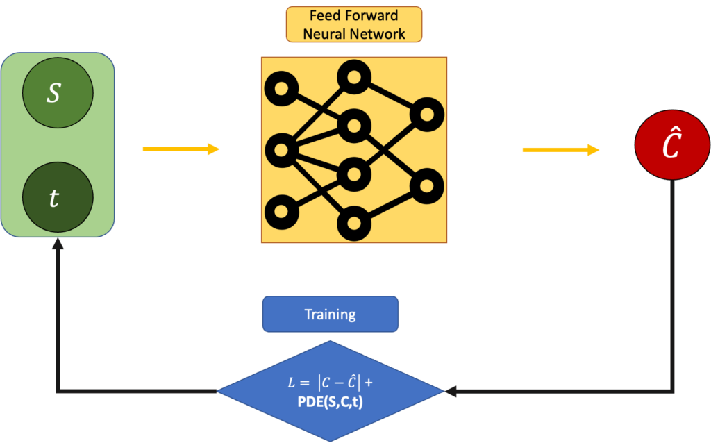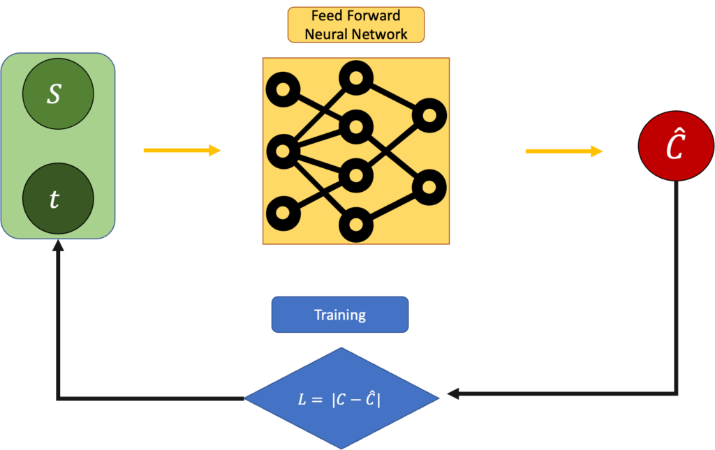 Now, the equation above is analytical, but again, that is an equation of a fair price in an ideal scenario. What happens if we ignore this for a moment and try to guess the price of the option given the stock price and the time? For example, we could use a Feed Forward Neural Network and train it through backpropagation.