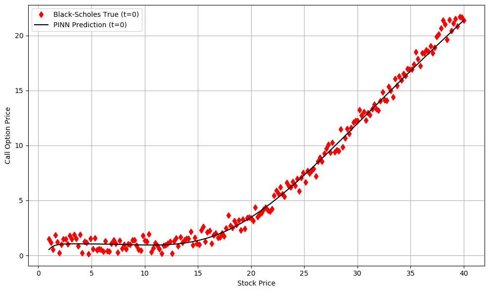 But the question still stands. Why is this “better” than the simple Black-Scholes? Why not just use the differential equation? Well, because sometimes, in life, solving the differential equation doesn’t guarantee you the “real” solution. Physics is usually approximating things, and it is doing that in a way that could create a difference between what we expect and what we see. That is why the PINN is an amazing and fascinating tool: you try to match the physics, but you are strict in the fact that the results have to match what you “see” from your dataset.