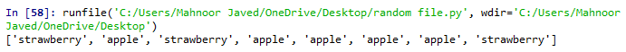 In the above code, we have given mylist as the input sequence to the choice() function, as well as the weights of each item in the list alongwith how long of an output list with randomly selected items we want. Notice the number of times the fruit “apple” occurs due to its increased weight.
