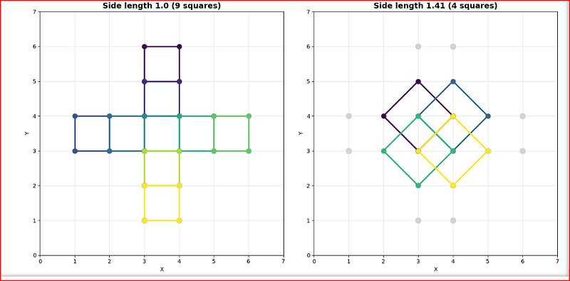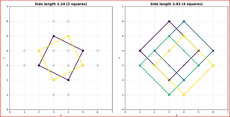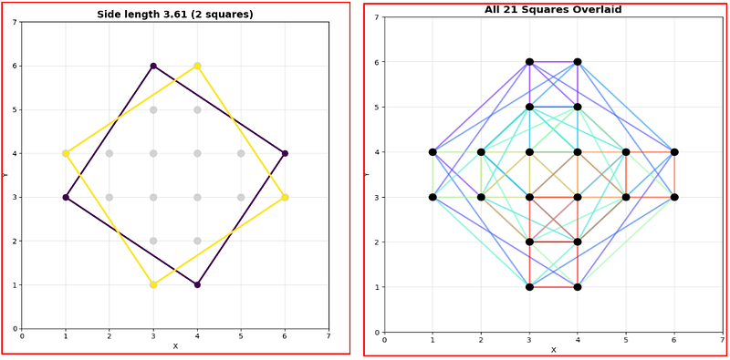 To my surprise, it produced a complete, correct Python solution in one shot. The code it generated not only found all 21 squares but also correctly categorised them by their unique side lengths and generated detailed plots to visualise them. While I needed one quick follow-up prompt to perfect the plots, the core problem was solved instantly.