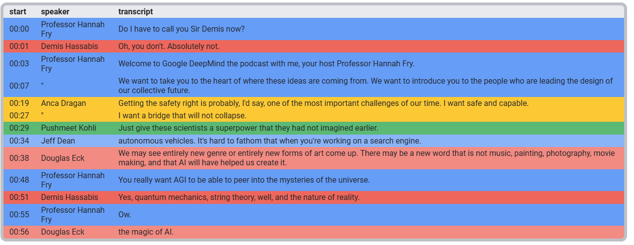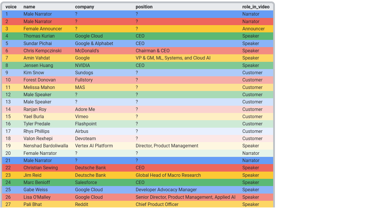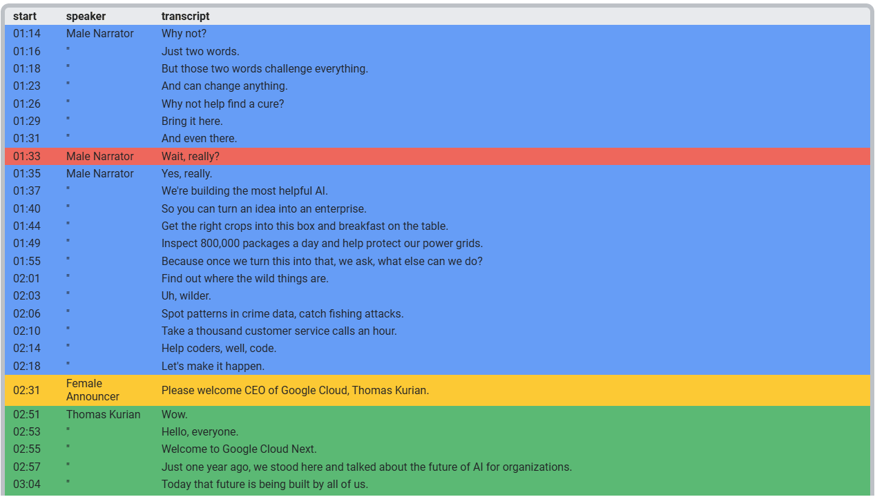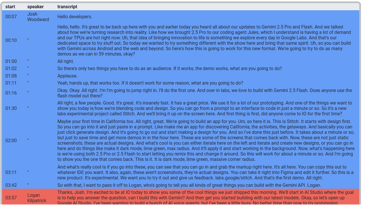 - For applications demanding the absolute highest transcription accuracy, we could isolate the audio-only transcription in a first request before performing speaker identification on the video frames in a second request. It might produce many more voice identifiers than actual speakers, but it should minimize false positives. In the second step, we’d reinject the transcription to focus on extracting and consolidating speaker data from the video frames. This two-step approach would also be a viable strategy to process very long videos, even those several hours in duration.