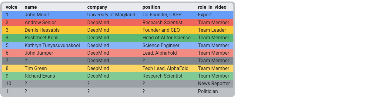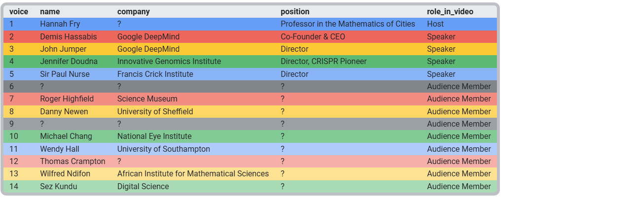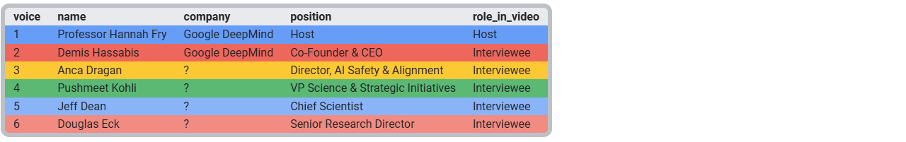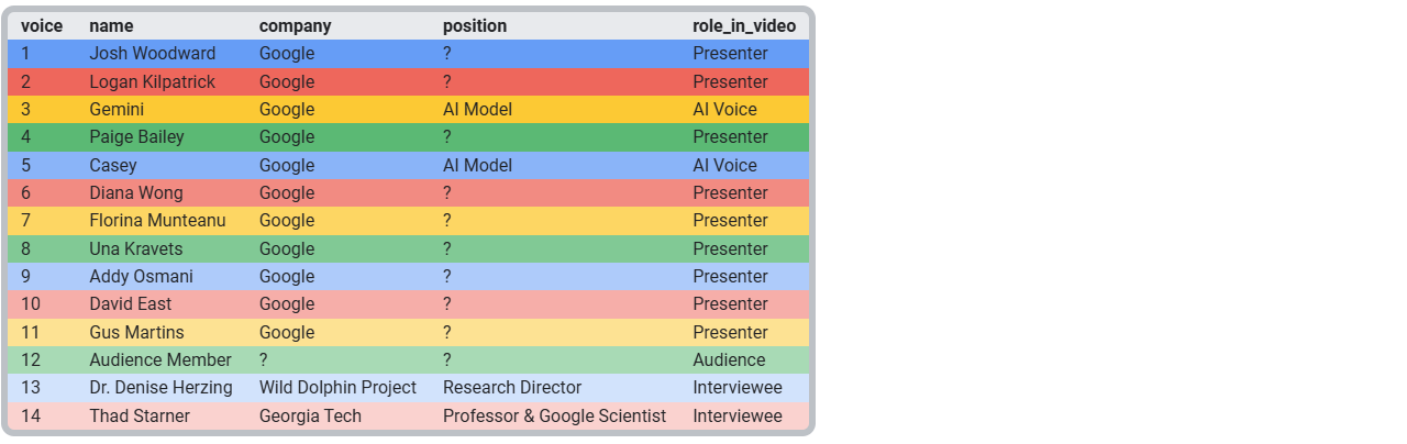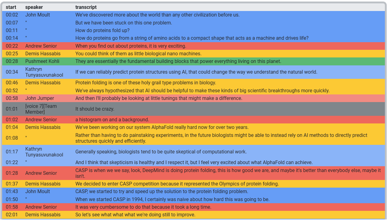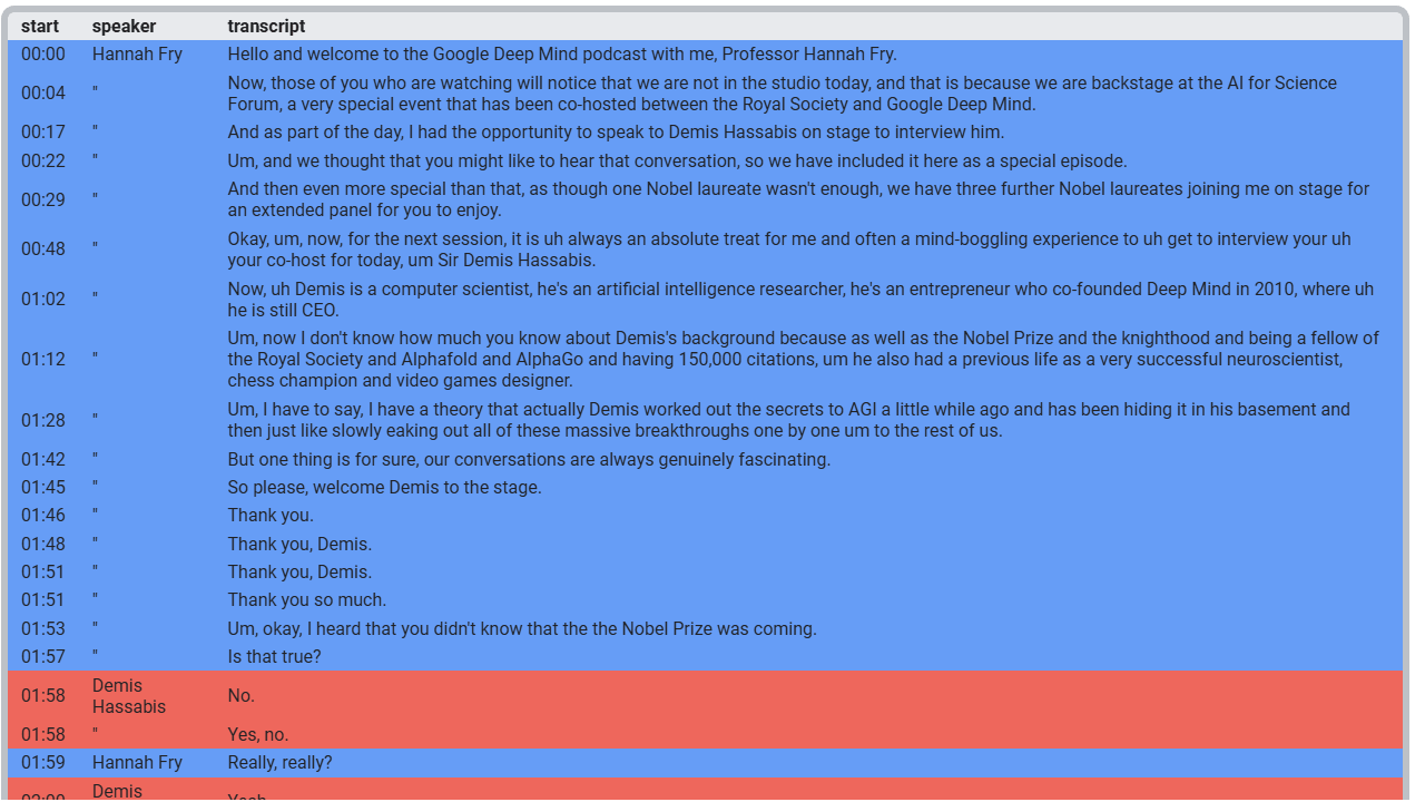 - For applications demanding the absolute highest transcription accuracy, we could isolate the audio-only transcription in a first request before performing speaker identification on the video frames in a second request. It might produce many more voice identifiers than actual speakers, but it should minimize false positives. In the second step, we’d reinject the transcription to focus on extracting and consolidating speaker data from the video frames. This two-step approach would also be a viable strategy to process very long videos, even those several hours in duration.