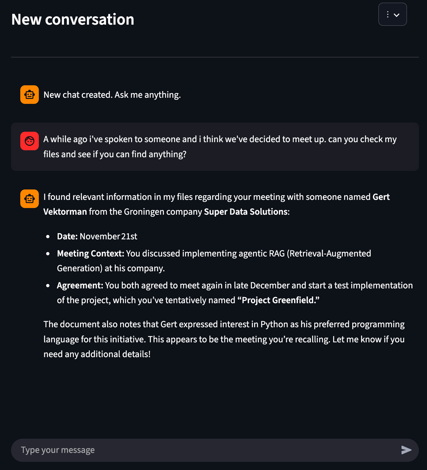 At this point, the user is chatting with their own private, fully local agent that is equipped with the ability to semantically search through their personal notes.