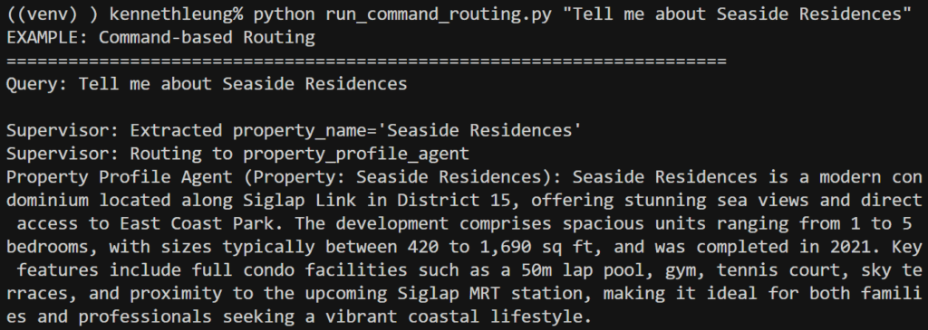 Commandthat updates the messages with the response and ends the graph. - If a handoff is needed, the node builds an update dictionary. It includes a routing message from the supervisor and the extracted context (e.g., the property name) in the graph state, so that the next agent can use it immediately.