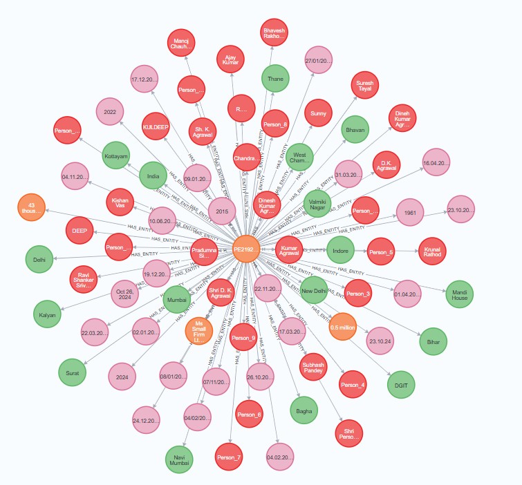 Note that in this prompt, we are not extracting any relations such as accused, witness etc. in the graph. All nodes will have a uniform “HAS_ENTITY” relation with the central node which is the Report Id. I have designed this as an extreme case, to illustrate the fact that we can answer queries about relations between entities even with this minimal graph, based on the retrieval pipeline depicted in the previous section. If you wish to include a few important relations, the prompt can be modified to include clauses such as the following: