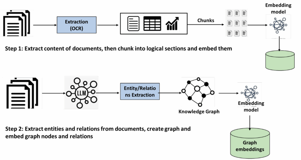 To recall from the previous article, the GraphRAG embedding pipeline used is as follows. The Graph node and relations and their embeddings are stored in a Graph database. Also, the document chunks and their embeddings are stored in the database.