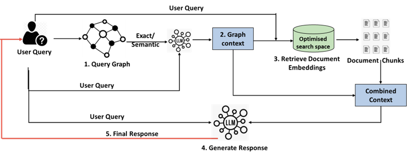 - Iterative search space optimisation, first by selecting the most relevant documents, and within those, the most relevant chunks (using context enrichment). This enables us to keep the graph simple, whereby all relations between the entities need not be necessarily extracted into the graph for queries about them to be answered accurately.