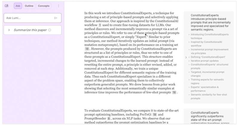 Lumi is an open-source tool from the People + AI Research group at Google and as with a lot of their work, it comes with a stunning and thoughtful UI. Lumi highlights the key parts of the paper and places short summaries in the side margin, so you always get to read the original paper along with AI generated sumamry. You can also click on any reference and it takes you straight to the exact sentence in the paper. The standout feature of Lumi is that it not only explains the text but you can also select an image and ask Lumi to explain it as well.
