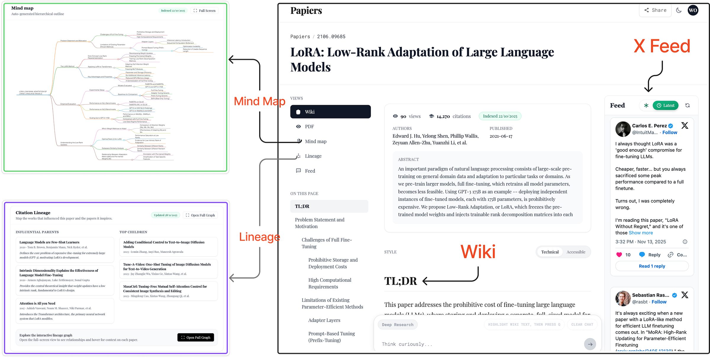 Papiers is a fairly new tool but already has some great features. For instance, in addition to getting conversations about the paper, you can get a Wiki-style view in two formats — technical and accessible so you can choose the format based on your comfort level with the topic. There is also a Lineage view that shows the paper’s parents and children, so you can see what shaped the work and what came after it. And there is also a mind map feature (think NotebookLM) that’s pretty neat.