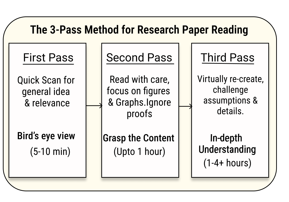 There was a time when all the reading was manual and we used to either print papers and read them or do so via an e-reader. During that time I was introduced to a paper by S. Keshav on the three-pass method. I’m sure you must have also come across it. It’s a simple yet elegant way of reading a paper by breaking the process into three steps.