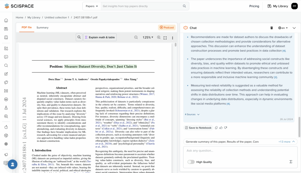 - SciSpace is a very versatile tool and in addition to being able to chat with a paper, you can do semantic literature reviews, go deep into research, write papers and even create visualisations for your work. There are many other things it offers, which you can explore in their suite. Like OpenRead, it is also a paid tool with limited features available in the free tier.