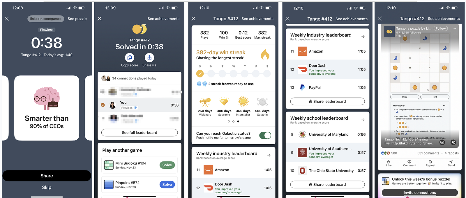 This kind of social interaction is valued by many LinkedIn users. Sharing your good game score is also similar to sharing a small achievement, so it does not work against the professional social network image of LinkedIn. As a result, LinkedIn Games creates a network effect that increases retention.