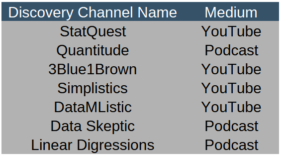 When choosing a discovery channel, it is important to choose a source that covers a broad range of topics. If I, for example, followed a podcast that focused on experimental design – I probably wouldn’t source a wide array of topics to study from it. It might be a great resource for DOE study, but it wouldn’t be a good discovery channel.